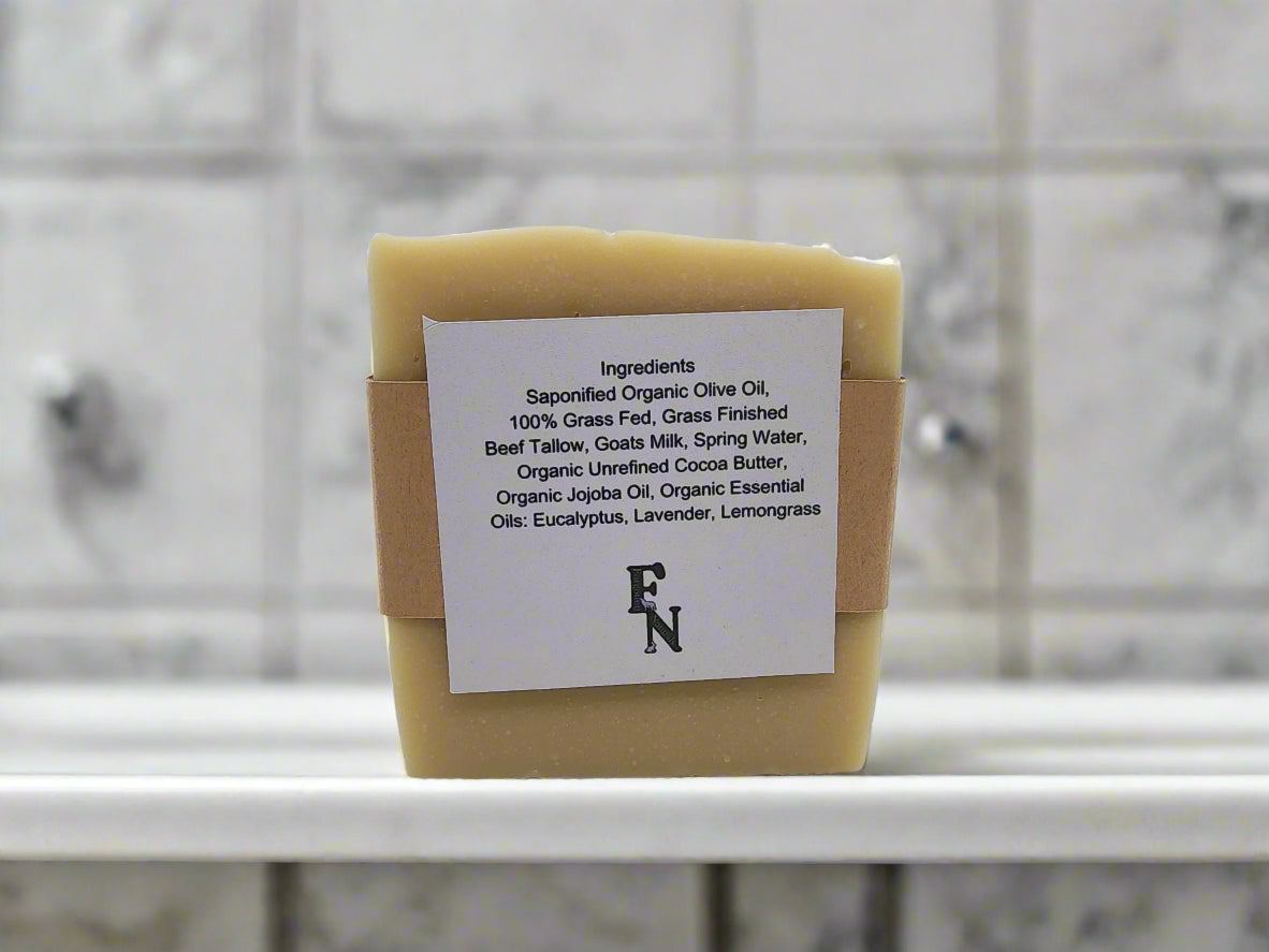 Freshen up with a bar of soap handcrafted with tallow for a moisturizing lather and scented with refreshing eucalyptus, calming lavender, and revitalizing lemongrass. Cleanse and invigorate your skin while enjoying a spa-like experience. Elevate your daily routine with this unique blend of fragrances.